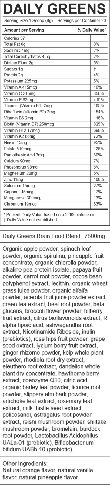 Daily Greens embodies the precision and expertise of PhD-level dedication. By leveraging cutting-edge science, our cognitive nutrition experts carefully select & optimize each ingredient to deliver unparalleled quality & value. Formulas are continuously assessed & updated.