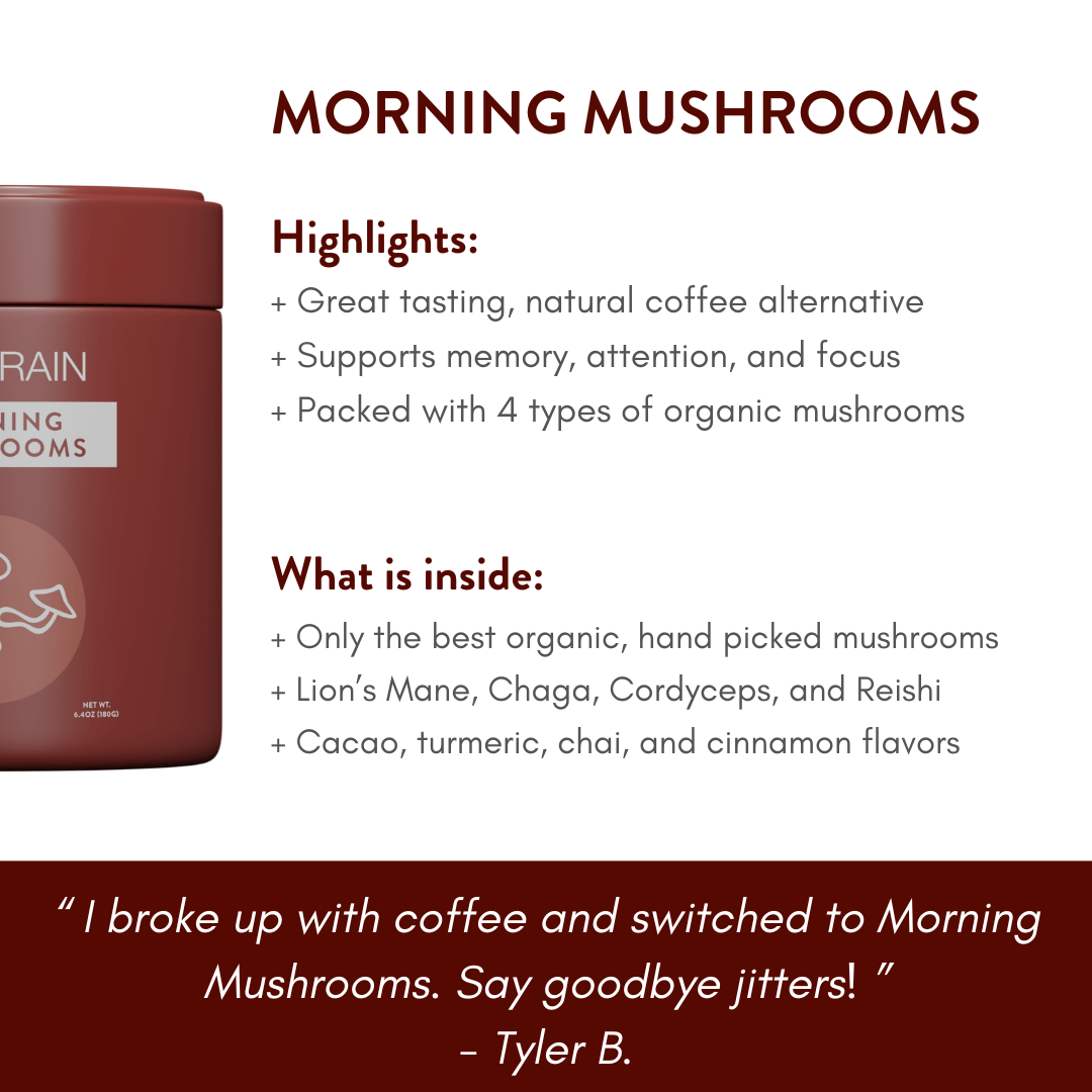 Meet your morning coffee alternative, powered by Organic Mushrooms. Support your memory, stimulate your attention and hone your focus with the best lineup of brain superfood mushrooms - Lion’s Mane, Chaga, Cordyceps, and Reishi. Flavored with cacao, turmeric, chai, and cinnamon. A great tasting coffee alternative or addition to coffee. Zero extra sweeteners.