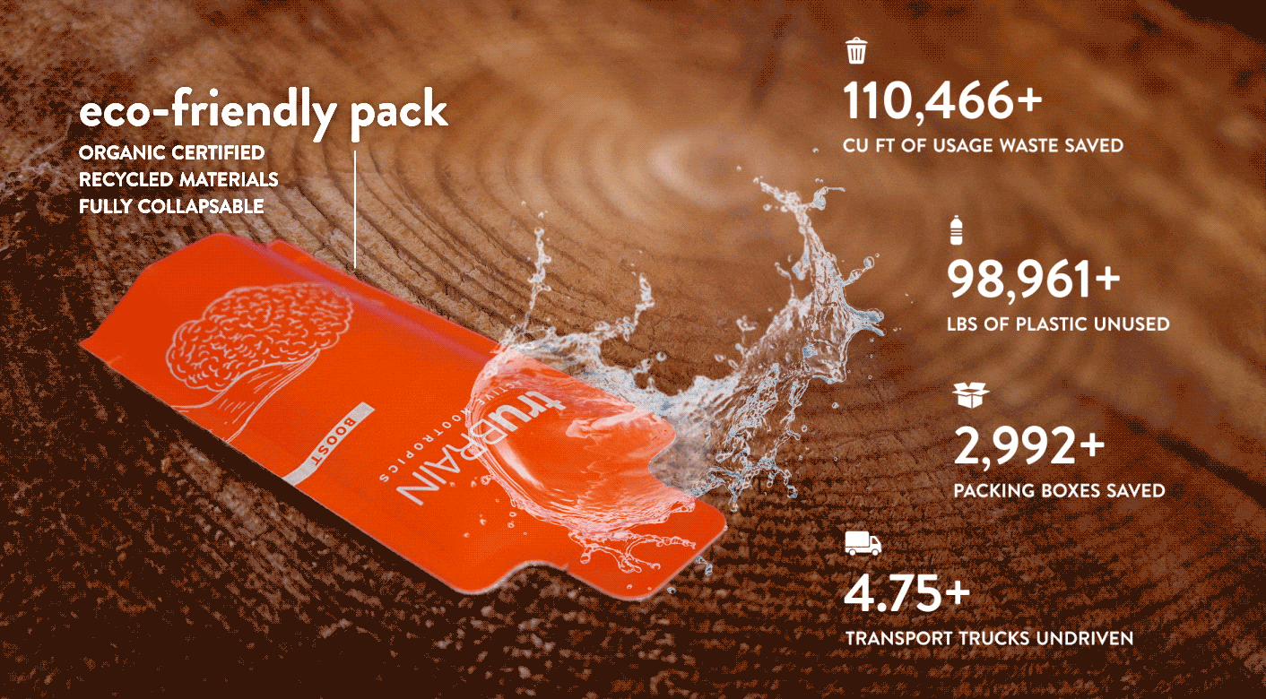 Our packaging is made of recycled paper. You can also recycle it. This drastically reduces plastic usage, and the concentrated, 1-ounce size means that we can ship more product for less. Compare this to heavy and bulky drinks that take more money and more fuel to transport. Smart packaging for a smarter brain.